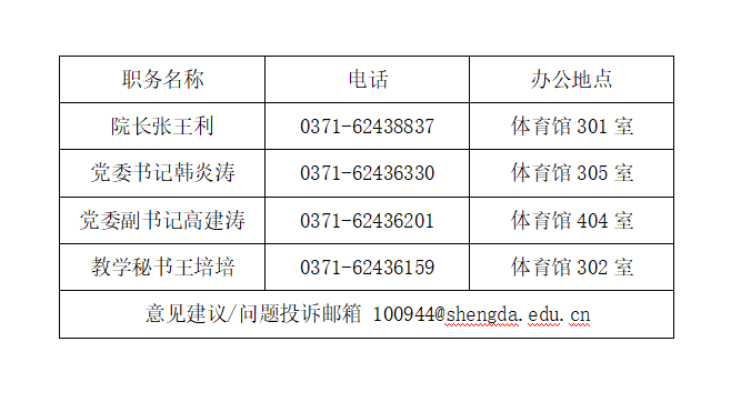 为畅通学生沟通渠道,及时收集和回应学生关心关切的事宜,特公布体育学院领导班子联系方式: