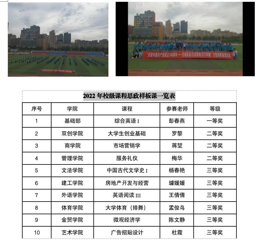 2022年4月份,在孟俊鸟老师带领下,大学体育(排舞)被评为校级课程思政样板课程,2021年6月带领150名学生参加首届校园排舞网络展示大赛中荣获高校组A组规定套路三等奖、自选套路二等奖、集体三等奖的好成绩。同年参加2021年全国排舞“百城联动、百年同庆、百万同跳”庆祝中国共产党成立100周年活动。