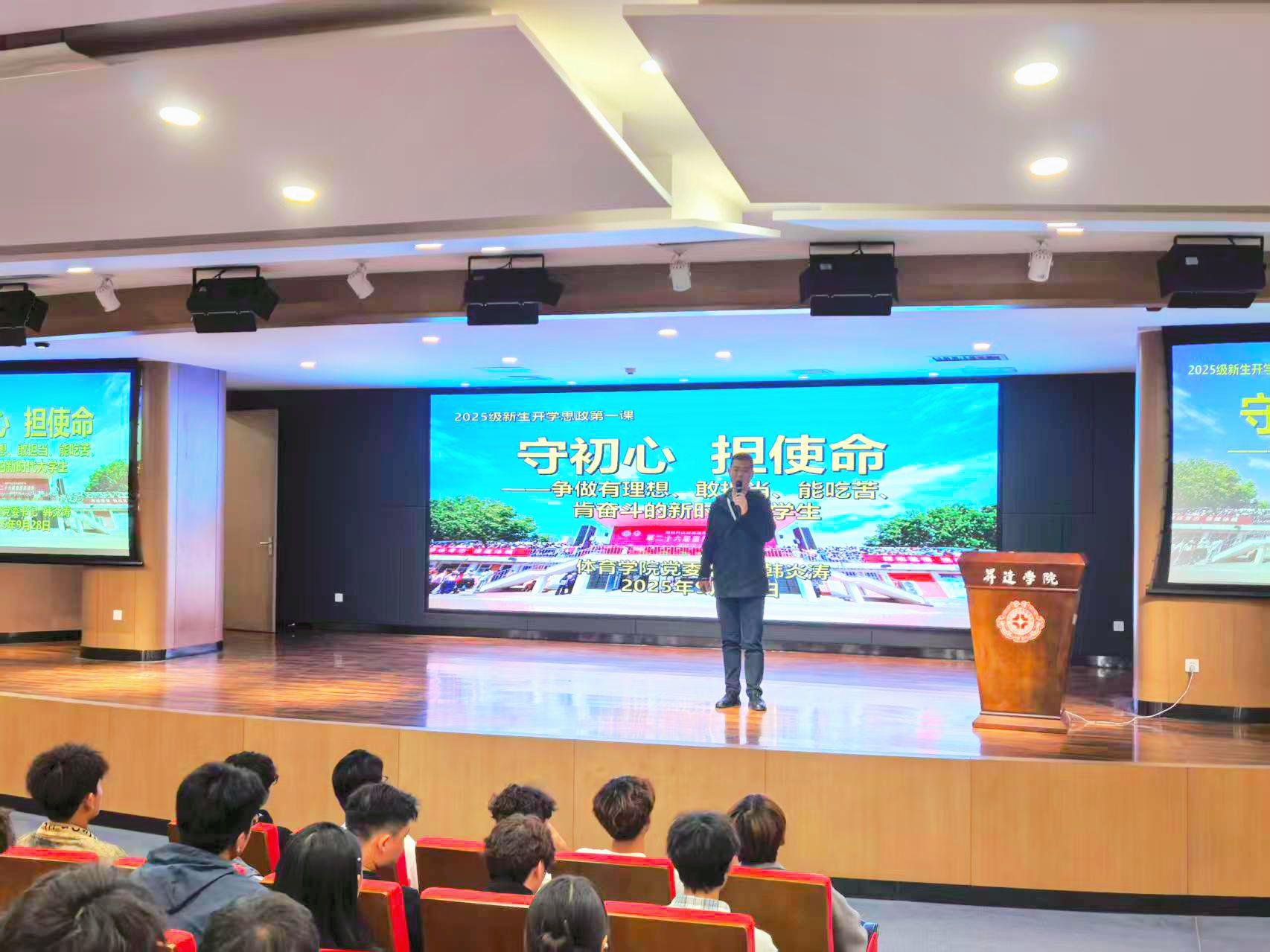 9月28日上午,体育学院党委书记韩炎涛在双创大讲堂为体育学院2025级全体新生讲授了一堂精彩的思政第一课,主题为“守初心 担使命——争做有理想、敢担当、能吃苦、肯奋斗的新时代大学生”。