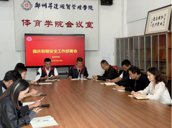 为保障国庆假期学院工作安全有序、防范事故,9月29日,体育学院召开国庆安全工作部署会。体育学院院长张王利、党委书记韩炎涛、党委副书记高建涛、各教研室主任及相关负责人参与了本次会议。