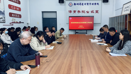 为深入贯彻落实学校关于安全卫生工作的系列部署要求,进一步压紧压实安全卫生管理责任链条,全力营造安全、整洁、有序的教学办公与运动训练环境,10月16日下午,体育学院组织召开安全卫生管理工作专题会议,体育学院全体教职工参加会议。