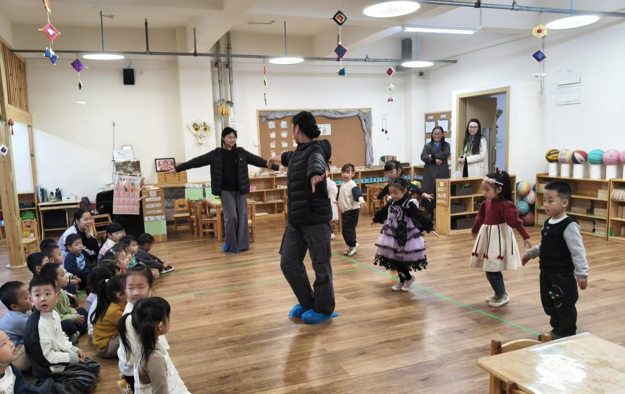 在梁田田园长的陪同下,韩炎涛书记一行在会后先后参观了幼儿园“六感公园”“成长走廊”“时光之门”等特色区域及12个融合教学班、早期介入组、康复训练室。在“六感公园”,访企团队看到柱子内嵌花椒、悬挂风铃、铺设麻绳纹理等感官设计,梁田田解释:“这些设施专为视障、孤独症儿童设计,通过听觉、触觉提示帮助他们建立环境认知。”在户外体育场地,团队观摩了幼儿分龄器械操活动,梁田田强调:“体育是身心融合的核心载体,但特殊需要儿童对运动强度、节奏需求差异大,急需专业体育教学支撑。” 韩炎涛书记特别关注了幼儿体能康复相关配置,详细询问了现有体育活动适配情况。参观结束后,体育学院学生代表为小朋友们带来体育舞蹈和健身健美展示,并带领主动参与的小朋友们进行教学和互动,现场响起阵阵掌声和欢笑声。