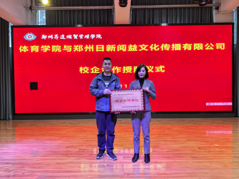 首先,体育学院和郑州日新阅益文化传播有限公司举行了校企合作授牌仪式,韩炎涛书记向企业授牌。