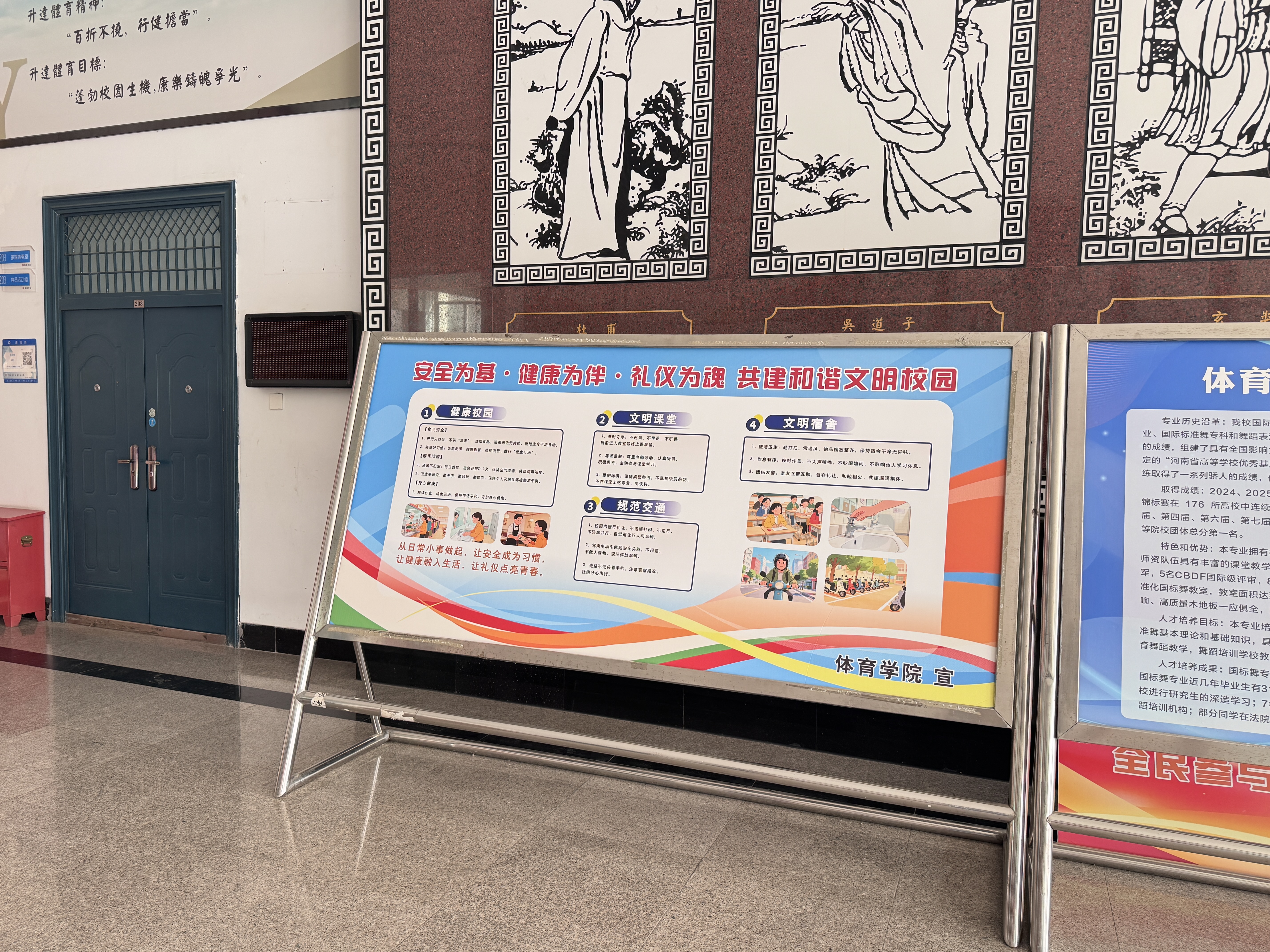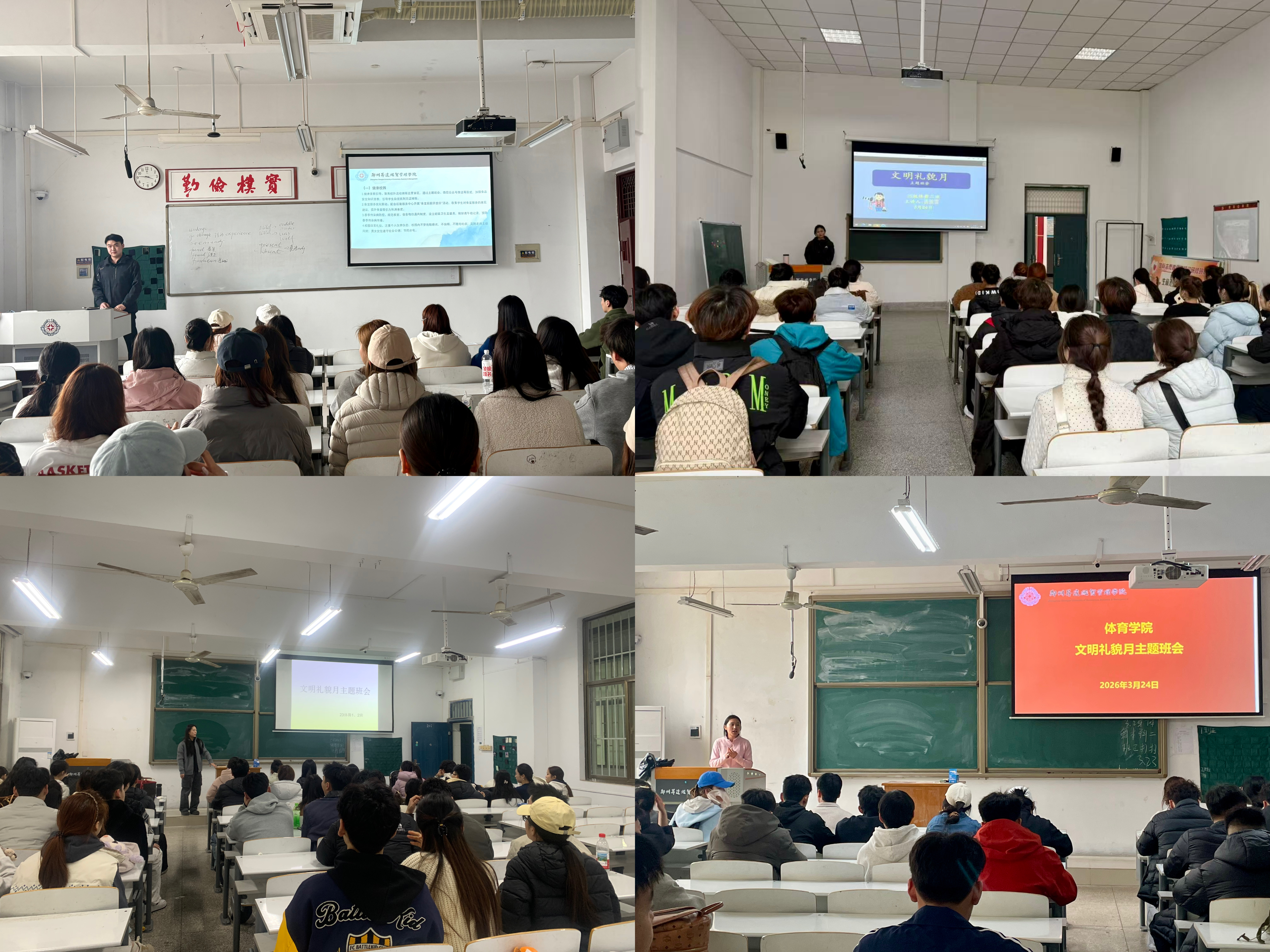 活动前期,学院召开专题部署会,明确分工,制定活动方案,围绕“健康校园、文明课堂、文明宿舍、健康身心、规范交通”五大核心内容,确保宣传活动有序推进,落到实处。会后,辅导员老师们召开主题班会,详细介绍文明礼貌月活动的实施方案,结合体育专业的特点,重点解读健康校园建设要点、课堂文明纪律、宿舍文明公约、身心调适方法及校园周边交通规范,引导学生深刻认识文明礼貌与安全意识的重要性。同时,学院在体育馆大厅设置宣传展板,展示文明礼貌相关的文明标语、安全知识,直观传递文明理念与安全常识,扩大宣传覆盖面。
