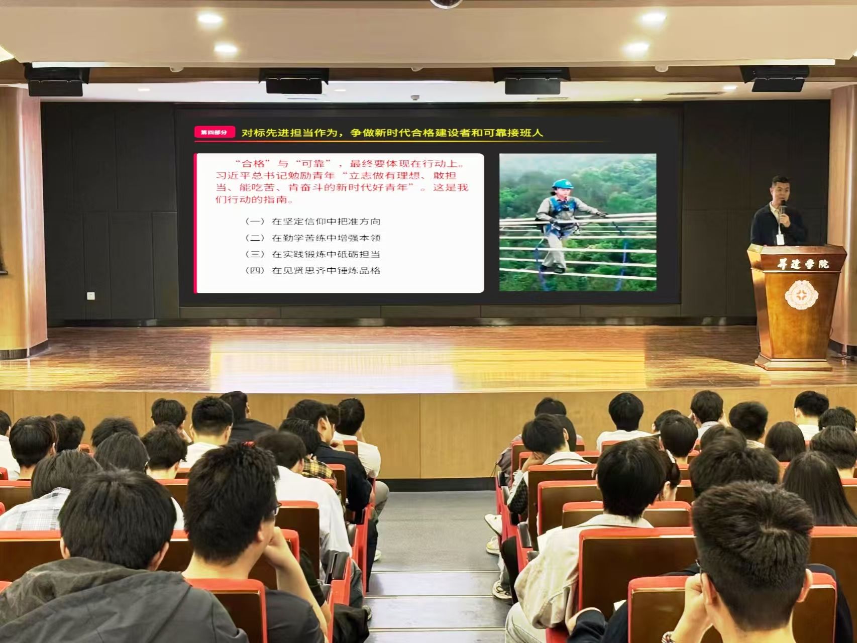 党课围绕党性修养的核心要义与“四讲四有”合格党员标准的实践要求,进行了系统阐述和深入讲解。韩炎涛指出,一是要以党的创新理论领航定向,校准个人奋斗的价值坐标。他强调,全体党员要持续深入学习党的最新理论成果,深刻把握新时代新征程的使命任务,将个人理想融入党和国家事业发展大局,确保奋斗方向不偏、价值追求纯正。二是感悟领袖风范与身边实践,把握党性修养的实践要求。韩炎涛结合习近平总书记从正定、宁德、浙江到上海的从政实践,他指出,党性修养贵在践行、重在日常,要从先进典范中汲取精神力量,在具体工作和日常言行中锤炼党性、检视自身。三是筑牢党性根基,提供坚实保障。韩炎涛强调,“四讲四有”是合格党员的行为准则,而坚定的党性是自觉践行这一准则的内在根基和持久动力。全体党员必须将加强党性修养作为终身必修课,时刻对照党章党规党纪,反躬自省,检视自身在政治信念、纪律观念、道德情操、担当精神等方面的差距与不足。四是对标先进作为,争当合格党员。韩炎涛号召全体学员“让红色基因融入血脉、红色精神照亮前行”,把爱党、爱国、爱校的情怀转化为刻苦训练、勤奋学习、拼搏进取、报效国家的强大动力,在青春的赛道上奋力奔跑,书写无愧于时代、无愧于人民的青春答卷。