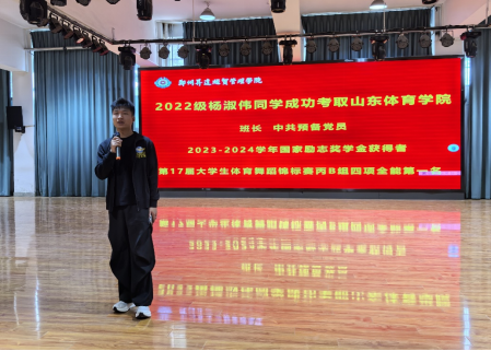 接下来,今年考取山东体育学院的2022级体育舞蹈表演本科2班的杨淑伟为同学们作考研成功经验分享。杨淑伟同学在班级里担任班长一职,中共预备党员,在校期间曾获得2023-2024学年国家励志奖学金,获得第17届大学生体育舞蹈锦标赛丙B组四项全能第一名、第八届河南省学生体育舞蹈六项全能项目第一名,顺利考取高中体育教师资格证。